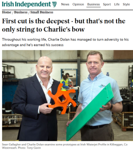 Most of these rubber parts had been traditionally cut by hand – a process that was neither safe nor efficient. As he began to explore ideas for his new business, Charlie decided that he could design and manufacture these rubber parts for his former employer, and for others. Today, Charlie’s company, Irish Waterjet Profile Ltd, employs 17 staff and has an annual turnover of €2.2m.
